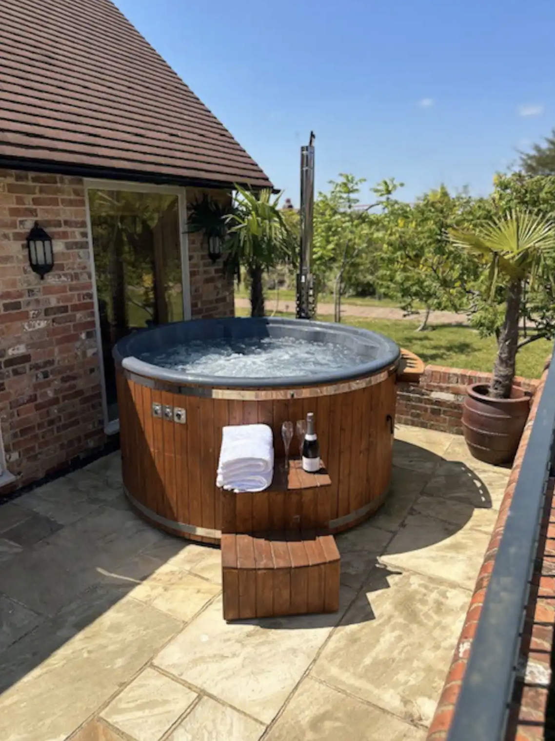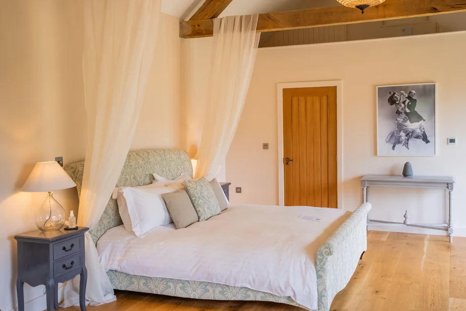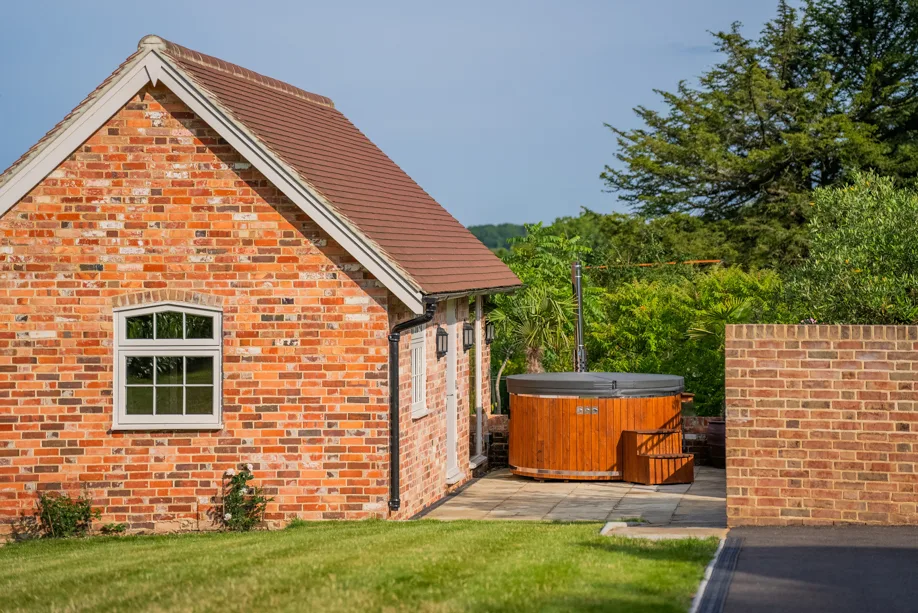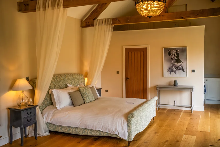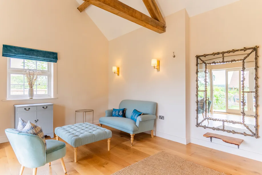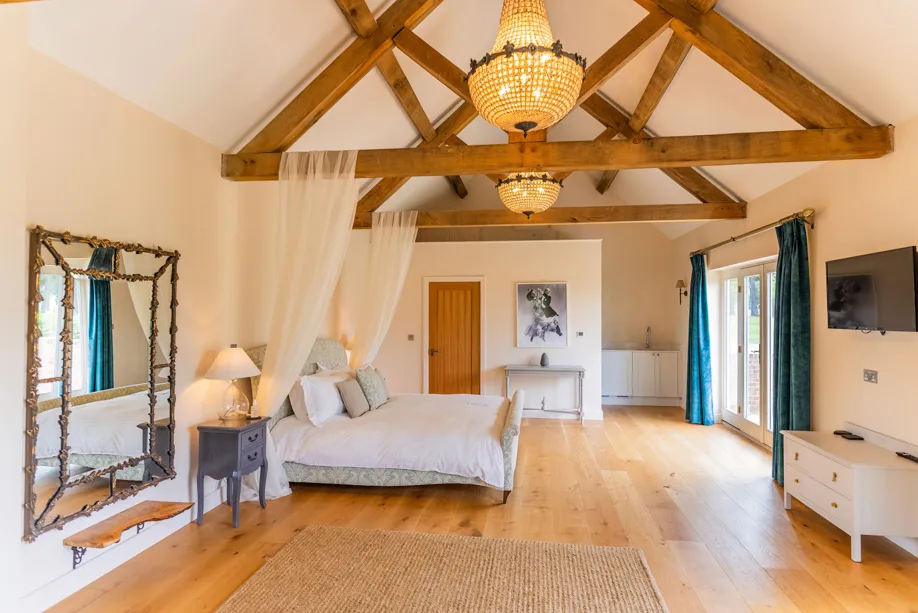 Indulge in the luxurious Oak Suite, nestled in a private courtyard with views of the surrounding countryside and lake. An open plan layout, featuring a charming kitchen, a super king-size bed, and a comfortable lounging area. Step outside to your personal wood-fired hot tub, treatment room, sauna room, a convenient getting-ready area, and an additional shower option. An excellent choice for accommodating mobile spa therapies and treatments during your stay.