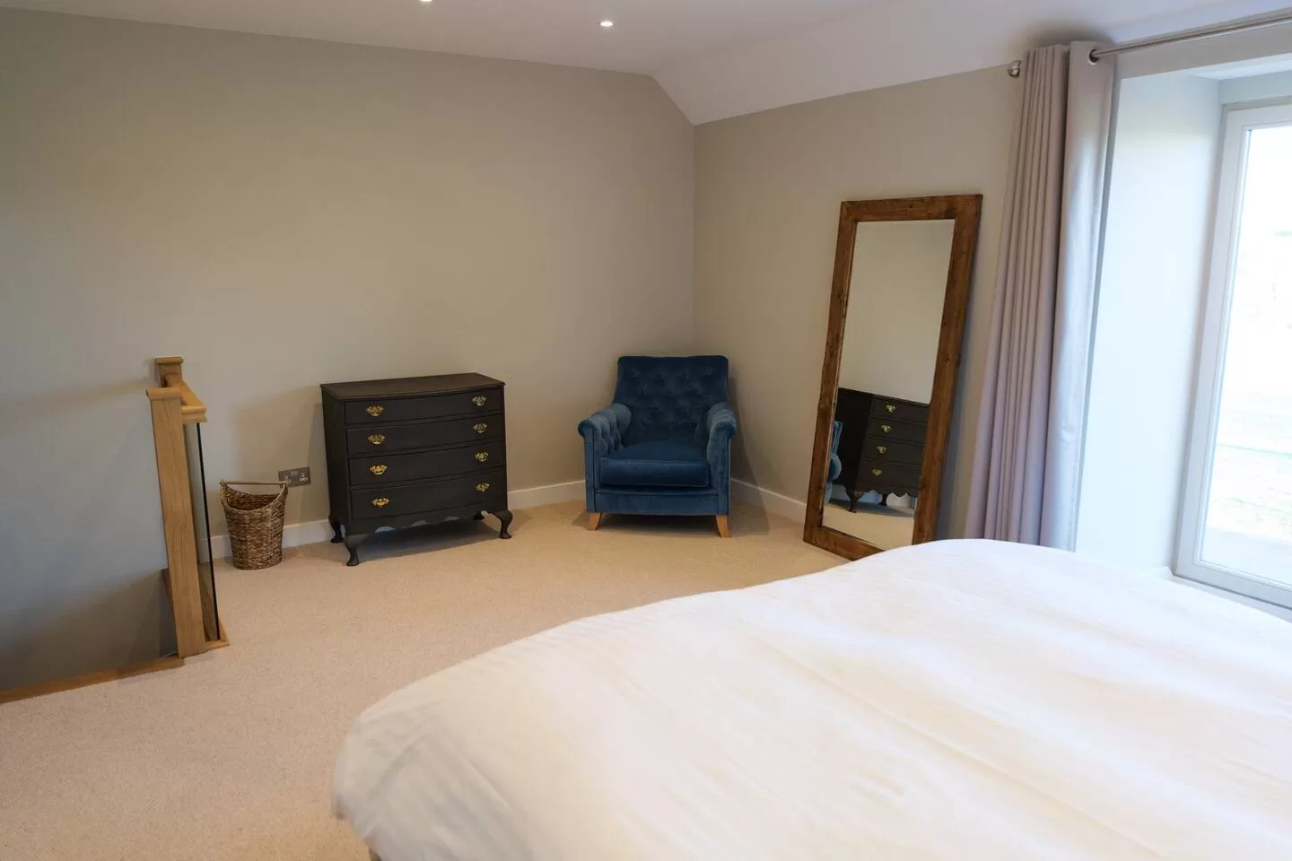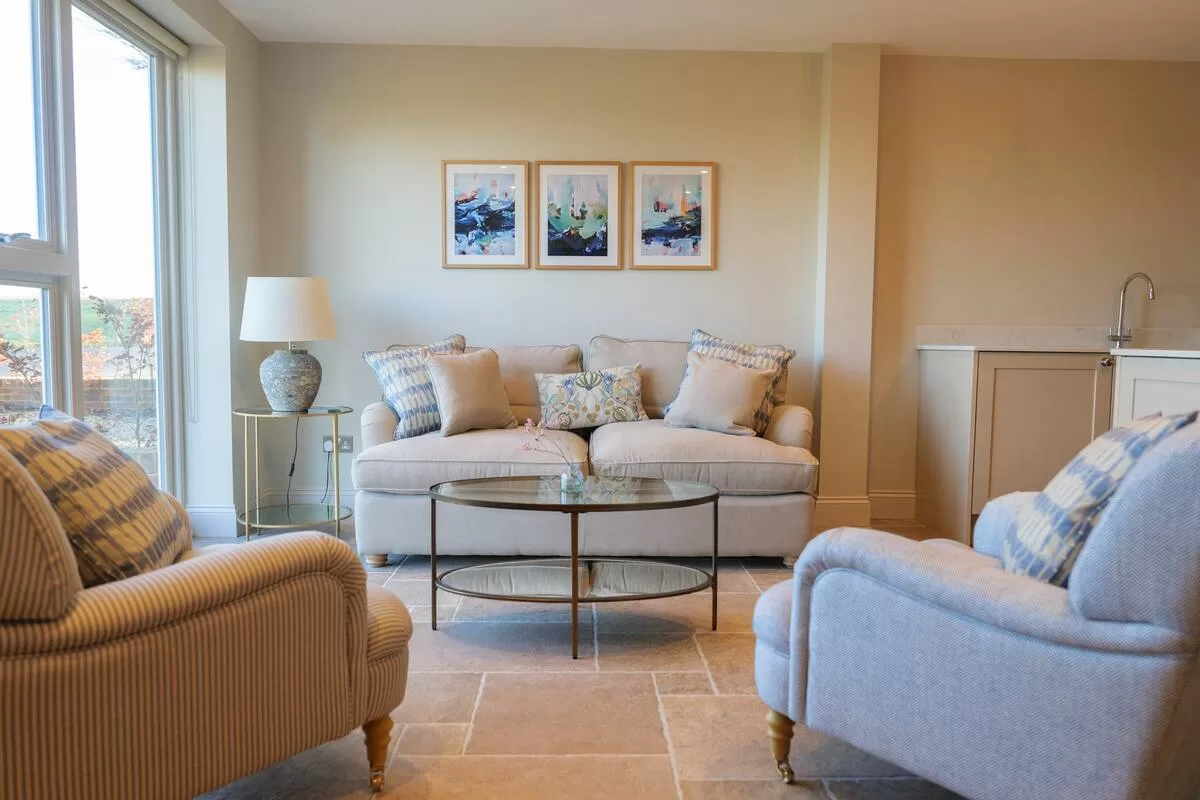 This spacious one-bedroom cottage offers a fully equipped kitchen with a Nespresso machine and a cozy living area on the ground floor. For additional sleeping arrangements, the living room features a plush pull-out sofa bed. Upstairs, guests can unwind in the generously sized bedroom, furnished with a lavish super king-size bed adorned with luxury bedding. The bathroom includes a convenient walk-in shower.