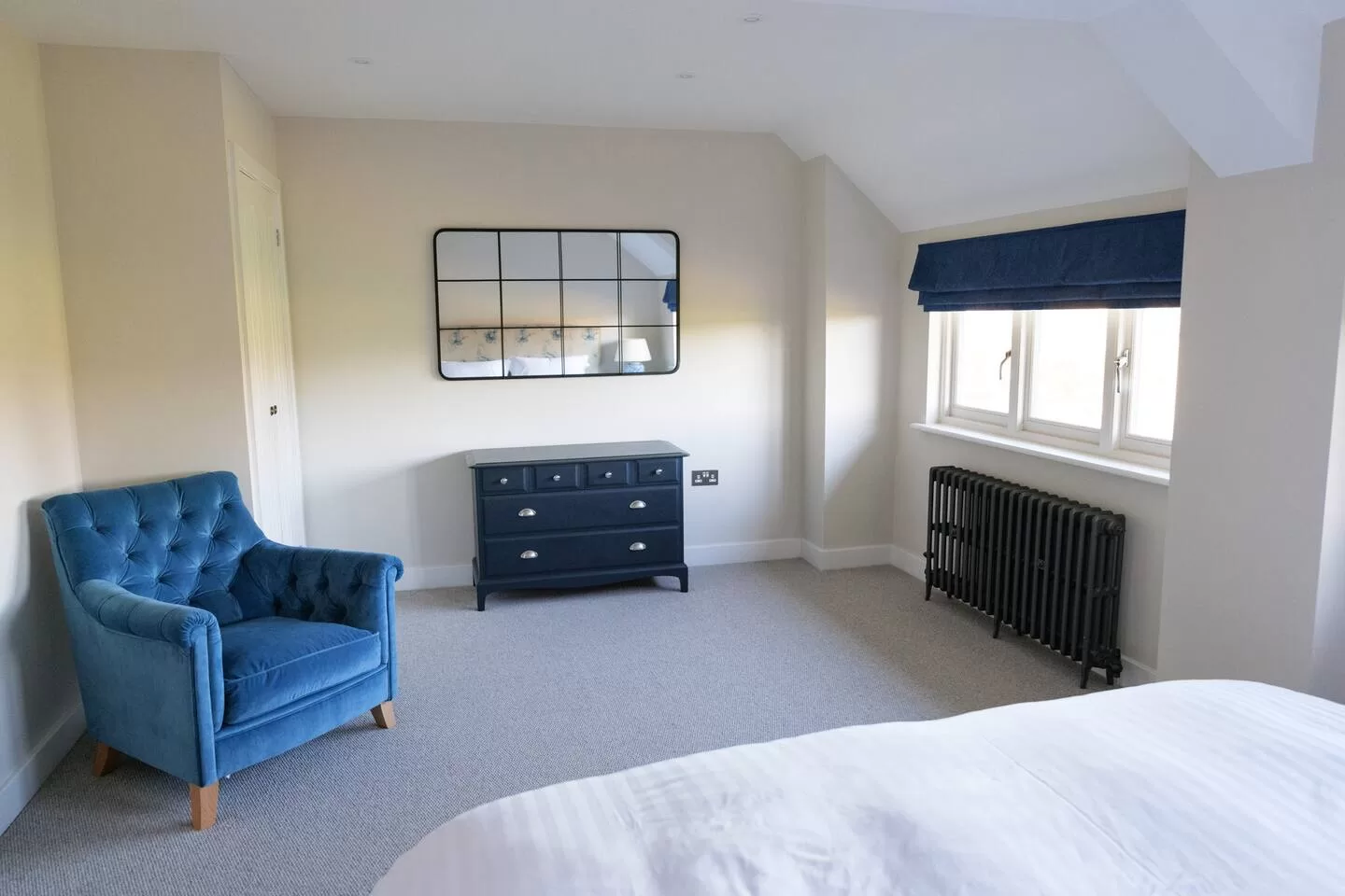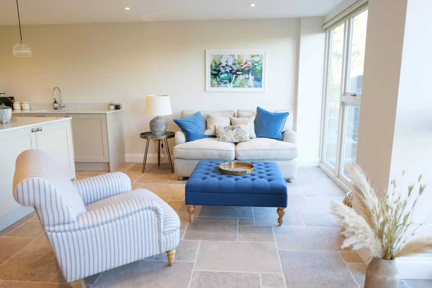 The cottage has been thoughtfully created to ensure the most comfortable stay for guests. Downstairs provides a fully fitted kitchen, breakfast bar and living area with incredibly comfy sofa bed. Upstairs is a super king bed with luxury bedding, chest of drawers and a wardrobe. There is a modern bathroom; a walk-in shower with Greentrees Signature Scent toiletries supplied. Enjoy the far reaching views over the fields from either the bedroom or living room.