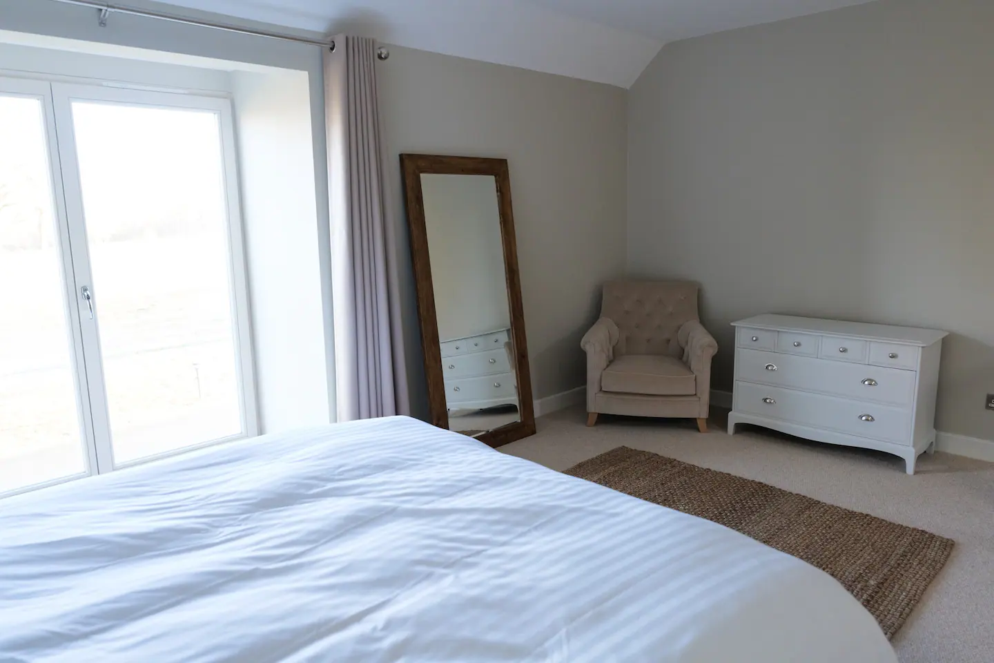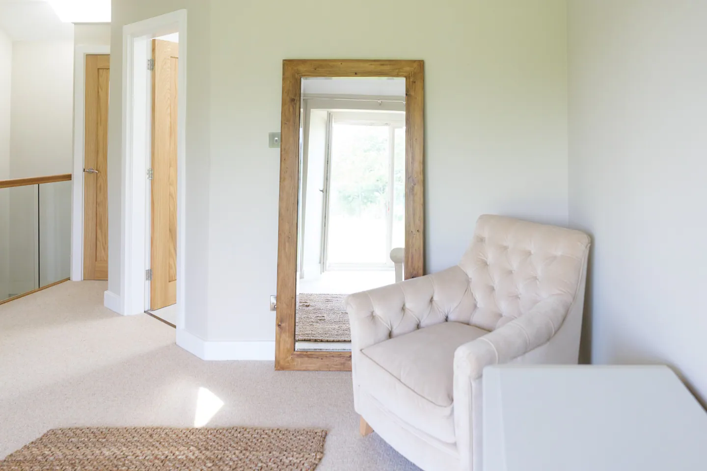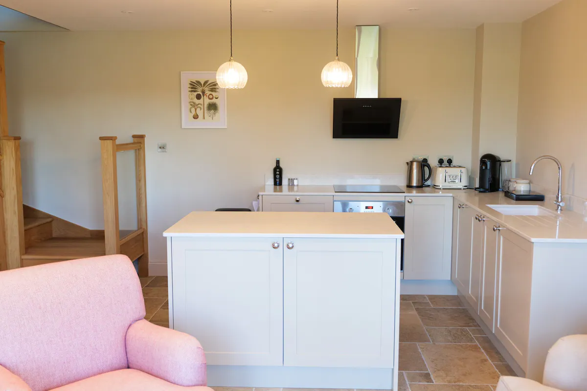 This roomy cottage offers ample space, allowing for plenty of natural light to fill the rooms. The first floor boasts a Juliette balcony, providing picturesque views of the surrounding fields and woodland. Guests can luxuriate in the generously sized bedroom, furnished with a super king-sized bed, featuring premium luxury bed linen. The bathroom includes a convenient walk-in shower.