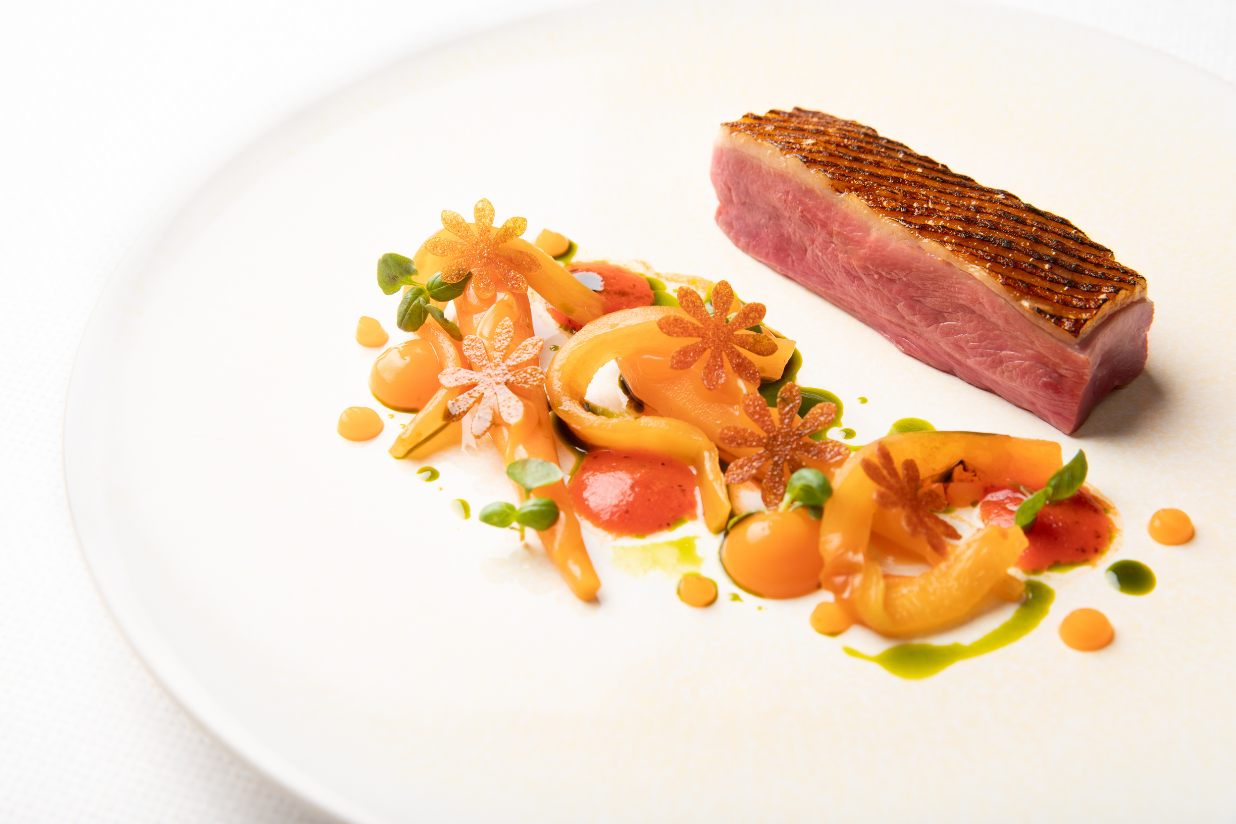Nori crusted fillet of salmon, buttered corn & leeks, corn puree, hash brown, corn shoots, sea herbs