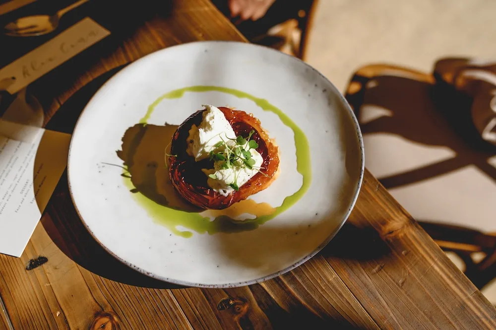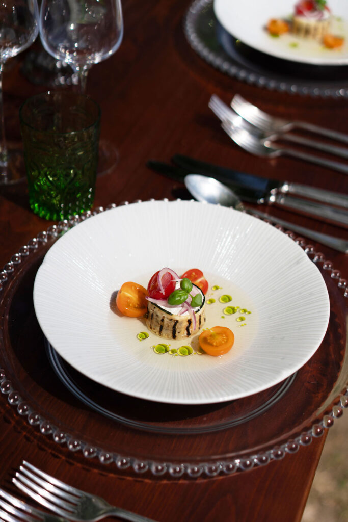 Marinated courgette, goats’ cheese, tomato consommé, basil oil, pickled red onion